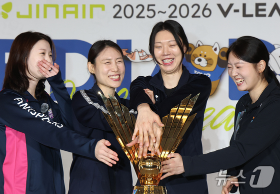 20일 오후 서울 강남구 호텔리베라청담에서 열린 프로배구 진에어 2025-2026 V리그 포스트시즌 미디어데이에서 여자부 참가팀 선수들이 우승 트로피 앞에서 익살스럽게 기념촬영을 하고 있다. 왼쪽부터 흥국생명 이다현, 한국도로공사 배유나, 현대건설 양효진, GS칼텍스 권민지. 2026.3.20 © 뉴스1 오대일 기자