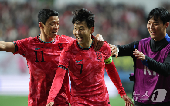 볼리비아를 상대로 프리킥 골을 성공시킨 뒤 기뻐하는 손흥민(가운데) 2025.11.14 © 뉴스1 김기태 기자