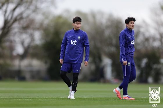 코트디부아르와의 평가전을 준비하는 박진섭(왼쪽)이 김민재와 함께 훈련하고 있다. (대한축구협회 제공)