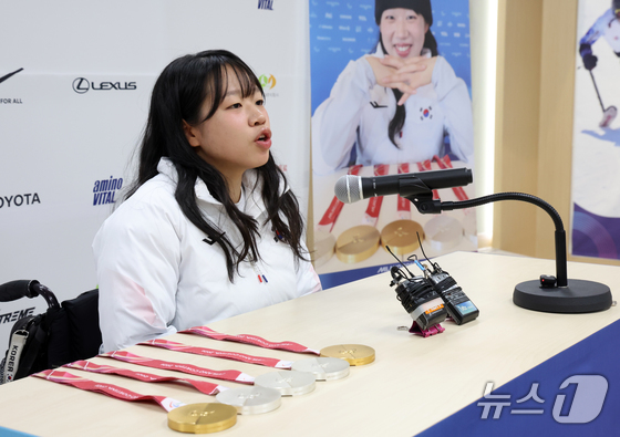 패럴림픽 2관왕 김윤지 선수가 26일 서울 송파구 출근하는 올림픽회관 신관 대한장애인 체육회에서 2026 밀라노·코르티나 동계패럴림픽대회 대한민국 선수단 MVP 기자회견을 하고 있다. 2026.3.26 © 뉴스1 김명섭 기자
