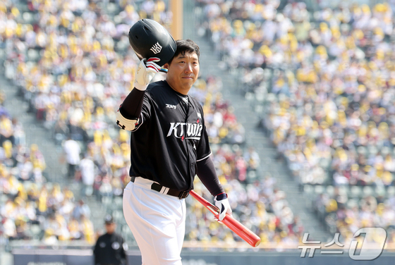 28일 서울 송파구 잠실야구장에서 열린 '2026 신한 SOL KBO리그' 공식 개막전 KT 위즈와 LG 트윈스의 경기, KT 김현수가 1회초 1사 타석에 들어서며 LG 팬들에게 헬멧을 벗어 인사하고 있다. 2026.3.28 © 뉴스1 김진환 기자
