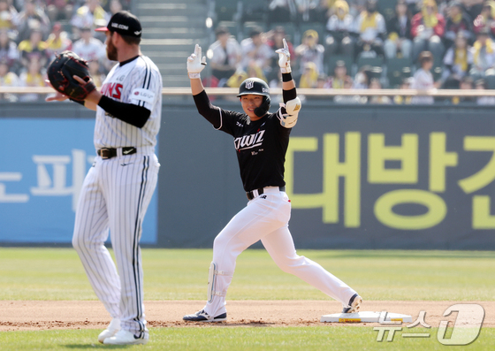 28일 서울 송파구 잠실야구장에서 열린 '2026 신한 SOL KBO리그' 공식 개막전 KT 위즈와 LG 트윈스의 경기, KT 이강민이 1회초 2사 1,2루 상황 싹쓸이 2타점 2루타를 친 뒤 환호하고 있다. 2026.3.28 © 뉴스1 김진환 기자
