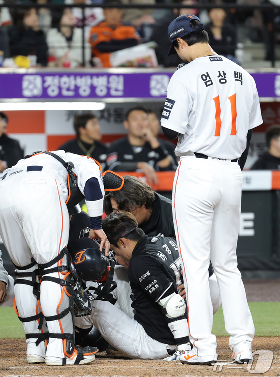 오랜 시간 그라운드에 쓰러져 있던 허경민은 다행히 스스로 일어나 더그아웃으로 돌아갔다. 걱정스러운 표정으로 허경민을 지켜보던 엄상백은 씁쓸한 표정으로 자리를 떠났다. 한화는 윤산흠을 급하게 마운드에 올렸다.
