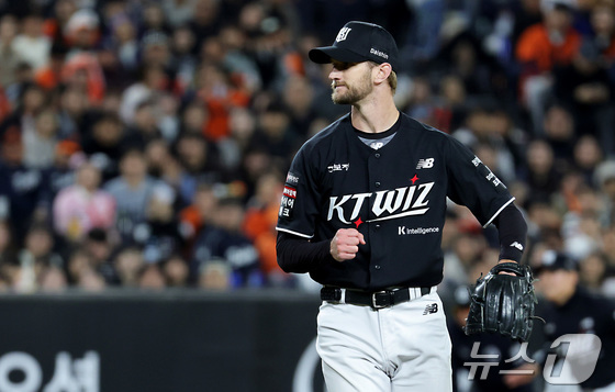 31일 대전 한화생명볼파크에서 열린 2026 신한 SOL KBO리그 KT 위즈와 한화 이글스의 경기에서 KT 보쉴리가 5회 한화 노시환을 삼진 잡으며 무실점 환호하고 있다. 2026.3.31 © 뉴스1 김기남 기자