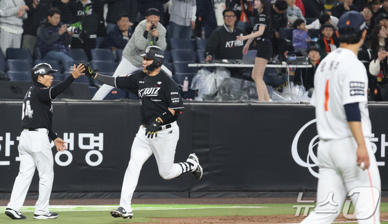 2일 대전 한화생명볼파크에서 열린 2026 신한 SOL KBO리그 KT 위즈와 한화 이글스의 경기 3회초 1사 만루 상황, KT 장성우가 만루 홈런을 친 뒤 기뻐하고 있다. 2026.4.2 © 뉴스1 김기남 기자