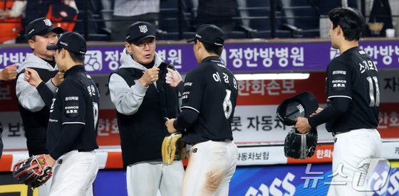 2일 대전 한화생명볼파크에서 열린 2026 신한 SOL KBO리그 KT 위즈와 한화 이글스의 경기에서 13:8로 KT가 승리한 가운데 이강철 감독이 시즌 개막 5연승을 자축하며 선수들과 하이파이브를 하고 있다. 2026.4.2 © 뉴스1 김기남 기자