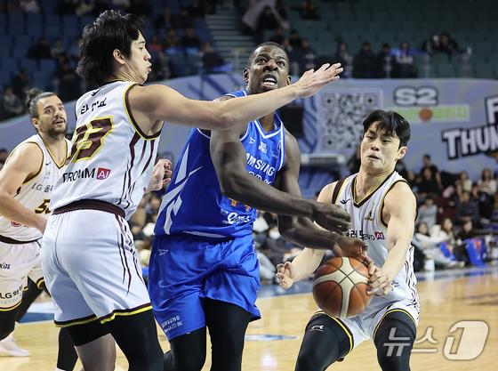 2일 오후 서울 송파구 잠실 잠실실내체육관에서 열린 2025-2026 LG전자 프로농구 정규리그 서울 삼성 썬더스와 창원 LG 세이커스의 경기, 3쿼터 창원 LG 유기상(오른쪽)이 골밑으로 돌파하는 서울 삼성 니콜슨의 공을 스틸하고 있다. 2026.1.2 © 뉴스1 김진환 기자