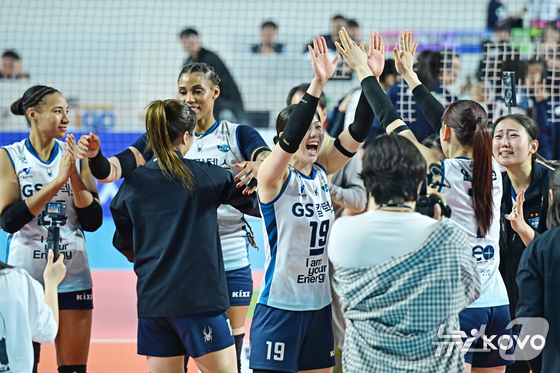 3일 경북 김천실내체육관에서 열린2025-2026 V-리그 포스트시즌 여자 프로배구 챔피언 결정전 2차전 한국도로공사와 GS칼텍스의 경기에서 득점에 성공한 GS칼텍스 선수들이 기뻐하고 있다. 이날 경기에서 GS칼텍스는 세트스코어 3대2로 승리했다. (KOVO 제공. 재판매 및 DB 금지) 2026.4.3 © 뉴스1