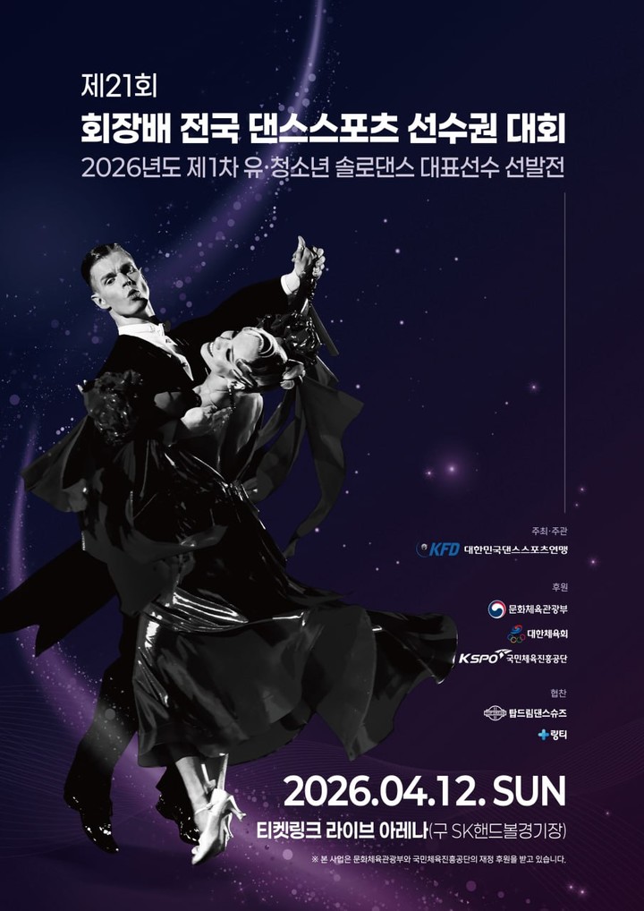특히 이번 대회에서는 우리나라 최초로 초등 고학년, 중고교 선수들을 대상으로 한 ‘제1차 유ㆍ청소년 솔로댄스 국가대표 선발전’을 겸하고 있어, 미래의 댄스스포츠 스타를 발굴하는 중요한 이정표가 될 것으로 보인다.