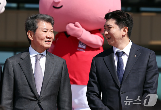 정몽규 대한축구협회장(왼쪽)과 유승민 대한체육회장이 7일 오후 충남 천안 서북구 코리아풋볼파크 개관식에서 대화하고 있다. 2026.4.7 © 뉴스1 구윤성 기자