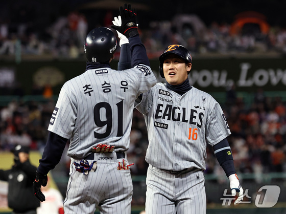 7일 오후 인천 미추홀구 SSG랜더스필드에서 열린 프로야구 '2026 신한 SOL KBO리그' SSG 랜더스와 한화 이글스의 경기, 3회초 한화 공격 2사 만루 때 하주석이 2타점 적시타를 치고 추승우 코치와 하이파이브 하고 있다. 2026.4.7 © 뉴스1 구윤성 기자