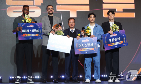 9일 오후 서울 강남구 그랜드 인터컨티넨탈 서울 파르나스 그랜드볼룸에서 열린 2025-2026 LG전자 프로농구 시상식에서 계량 부문 수상자들이 기념촬영을 하고 있다. 왼쪽부터 득점상 및 블록상 자밀 워니(서울 SK), 리바운드상 및 스틸상 아셈 마레이(창원 LG), 이수광 KBL 총재, 어시스트상 허훈(부산 KCC), 3점슛상 허웅(부산 KCC). 2026.4.9 © 뉴스1 오대일 기자