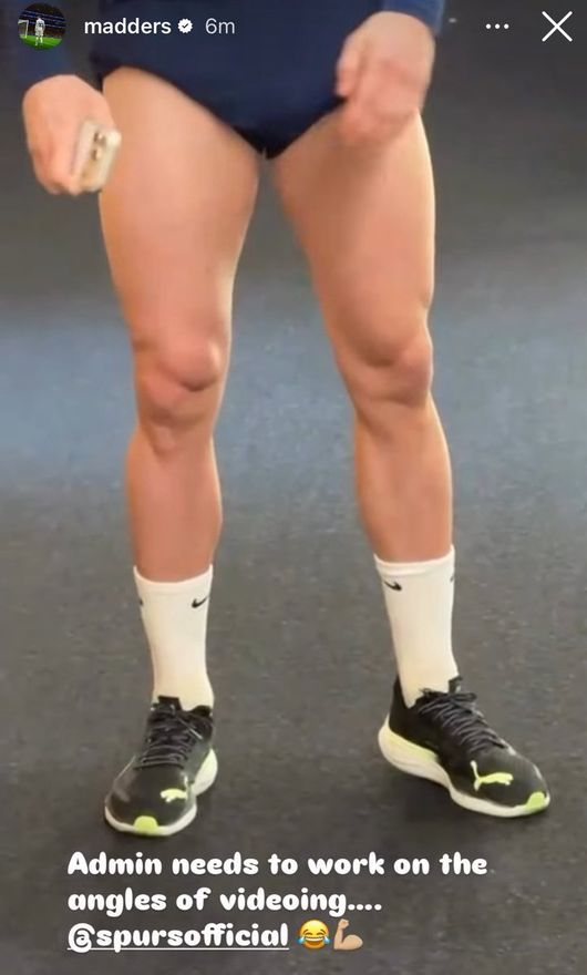 매디슨은 다시 한번 양쪽 허벅지를 찍은 영상을 공유했는데 정면에서 촬영한 그의 다리 근육은 작아 보이지 않았다. 실제로는 왼쪽과 오른쪽 크기가 비슷했다. 매디슨은 토트넘 공식 계정을 태그하며 "영상 촬영 각도를 좀 더 신경 써야겠네"라고 적었다.