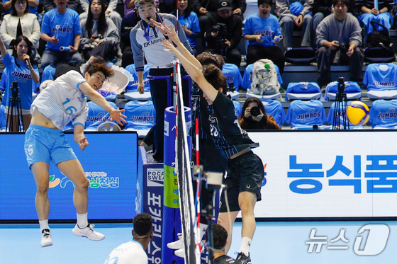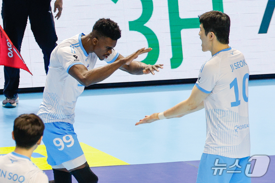 10일 오후 인천 계양체육관에서 열린 프로배구 2025-2026 V-리그 남자부 챔피언 결정전 5차전 대한항공 점보스와 현대캐피탈 스카이워커스의 경기, 대한항공 마쏘가 레오 공격을 막아낸 뒤 주장 정지석과 기뻐하고 있다. 2026.4.10 © 뉴스1 안은나 기자