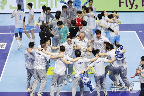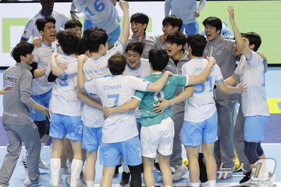 대한항공 점보스 선수들이 10일 오후 인천 계양체육관에서 열린 프로배구 2025-2026 V-리그 남자부 챔피언 결정전 5차전 현대캐피탈 스카이워커스와의 경기에서 승리 후 우승을 확정짓고 환호하고 있다. 2026.4.10 © 뉴스1 안은나 기자