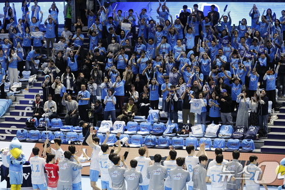 대한항공 점보스 팬들이 10일 오후 인천 계양체육관에서 열린 프로배구 2025-2026 V-리그 남자부 챔피언 결정전 5차전 대한항공 점보스와 현대캐피탈 스카이워커스의 경기에서 대한항공 승리 후 우승을 확정짓고 환호하고 있다. 2026.4.10 © 뉴스1 안은나 기자