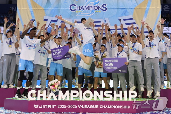 대한항공 점보스 선수들이 10일 오후 인천 계양체육관에서 열린 프로배구 2025-2026 V-리그 남자부 챔피언 결정전 5차전 현대캐피탈 스카이워커스와의 경기에서 승리 후 우승 세레머니를 하고 있다. 2026.4.10 © 뉴스1 안은나 기자