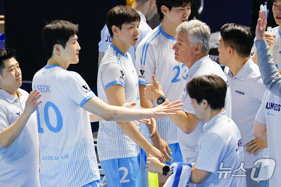 10일 오후 인천 계양체육관에서 열린 프로배구 2025-2026 V-리그 남자부 챔피언 결정전 5차전 대한항공 점보스와 현대캐피탈 스카이워커스의 경기, 대한항공 헤난 달 조토 감독이 작전지시를 하고 있다. 2026.4.10 © 뉴스1 안은나 기자