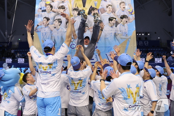 대한항공 점보스 선수들이 10일 오후 인천 계양체육관에서 열린 프로배구 2025-2026 V-리그 남자부 챔피언 결정전 5차전 현대캐피탈 스카이워커스와의 경기에서 우승을 차지하고 헤난 달 조토 감독을 헹가래 치고 있다. 2026.4.10 © 뉴스1 안은나 기자