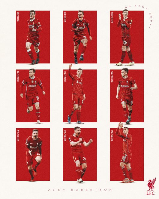 2017년 헐 시티를 떠나 이적한 뒤 쭉 리버풀의 왼쪽 수비를 책임져 온 로버트슨. 그는 "난 리버풀에서 만든 놀라운 기억들을 언제나 되돌아볼 거다. 9년 동안 이 클럽에 내 모든 것, 내 심자과 영혼을 쏟아부었다. 후회는 없다"라며 "축구는 계속 흘러가고, 팀도 변화한다. 이제는 내가 새로운 길로 나아갈 때"라고 안녕을 고했다.