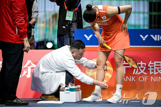 '셔틀콕 여제' 안세영이 12일(한국시간) 중국 닝보에서 열린 2026 아시아배드민턴선수권대회 여자 단식 결승전 중국의 왕즈이와의 경기에서 의료진의 치료를 받고 있다. 안세영은 세계 랭킹 2위 왕즈이에 1시간 40분 동안 펼쳐전 혈전 끝에 게임 스코어 2대1(21대12, 17대21, 21대18) 승리를 거두며 시니어 무대 진입 뒤 처음으로 아시아 선수권을 제패했다. © 신화=뉴스1