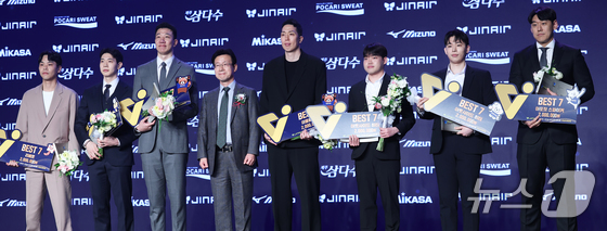 13일 오후 서울 광진구 그랜드 워커힐 호텔에서 열린 프로배구 진에어 2025-2026 V리그 시상식에서 남자부 베스트7에 선정된 선수들이 기념촬영을 하고 있다. 왼쪽부터 한국전력 정민수, 현대캐피탈 황승빈, 한국전력 신영석, SBS미디어넷 조재룡 대표, 현대캐피탈 최민호, 현대캐피탈 레오(대리 수상), 우리카드 알리(대리 수상), 한국전력 베논(대리 수상). 2026.4.13 © 뉴스1 오대일 기자