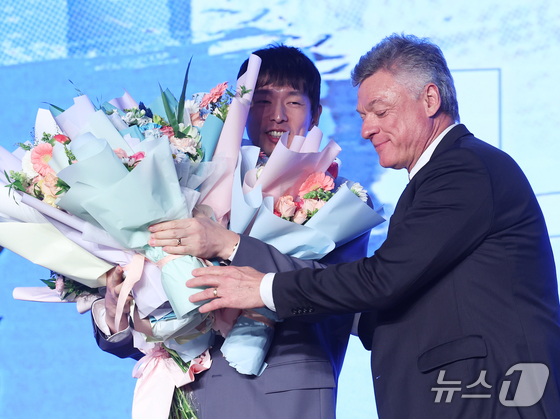 13일 오후 서울 광진구 그랜드 워커힐 호텔에서 열린 프로배구 진에어 2025-2026 V리그 시상식에서 여자부 감독상을 수상한 GS칼텍스 이영택 감독이 축하 꽃다발을 받고 있다. 2026.4.13 © 뉴스1 오대일 기자