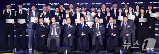13일 오후 서울 광진구 그랜드 워커힐 호텔에서 열린 프로배구 진에어 2025-2026 V리그 시상식에서 수상자와 내빈들이 포즈를 취하고 있다. 2026.4.13 © 뉴스1 오대일 기자