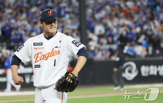 14일 대전 한화생명볼파크에서 열린 2026 신한 SOL KBO리그 삼성 라이온즈와 한화 이글스의 경기에서 3회초 한화 문동주가 삼성 디아즈의 안타를 호수비로 막은 페라자에게 고마움을 표시하고 있다. 2026.4.14 © 뉴스1 김기남 기자