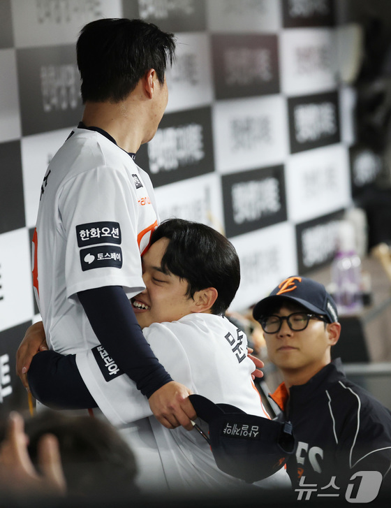 14일 대전 한화생명볼파크에서 열린 2026 신한 SOL KBO리그 삼성 라이온즈와 한화 이글스의 경기 6회초 2사 만루 상황, 한화 김종수가 호투로 위기를 넘기자 문동주가 기뻐하고 있다. 2026.4.14 © 뉴스1 김기남 기자