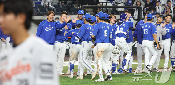 14일 대전 한화생명볼파크에서 열린 2026 신한 SOL KBO리그 삼성 라이온즈와 한화 이글스의 경기에서 9회 역전승을 거둔 삼성 선수들이 기뻐하고 있다. 2026.4.14 © 뉴스1 김기남 기자