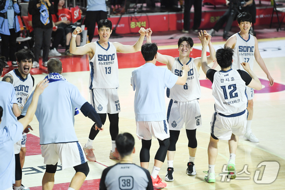 소노 스카이거너스 선수들이 14일 오후 서울 송파구 잠실학생체육관에서 열린 프로농구 6강 플레이오프 SK나이츠와의 경기에서 105:76으로 승리, 기뻐하고 있다. (KBL 제공. 재판매 및 DB 금지) 2026.4.14 © 뉴스1