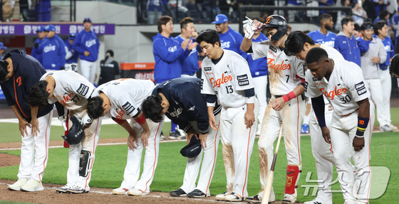 14일 대전 한화생명볼파크에서 열린 2026 신한 SOL KBO리그 삼성 라이온즈와 한화 이글스의 경기에서 9회 역전패 당한 한화 선수단이 인사하고 있다. 2026.4.14 © 뉴스1 김기남 기자