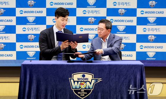 프로배구 남자부 우리카드의 박철우 신임감독(왼쪽)이 16일 서울 중구 프레스센터에서 열린 '우리카드 배구단 박철우 감독 취임 기자회견' 진성원 구단주와 계약서를 교환하고 있다. 박 감독은 올해 1월부터 파에스 전 감독의 뒤를 이어 감독대행으로 지휘봉을 잡아 후반기 18경기에서 14승 4패를 기록하며 포스트시즌에 진출하는 성과를 만들어내며 이번에 우리은행 제5대 감독으로 공식 선임됐다. 2026.4.16 © 뉴스1 이호윤 기자