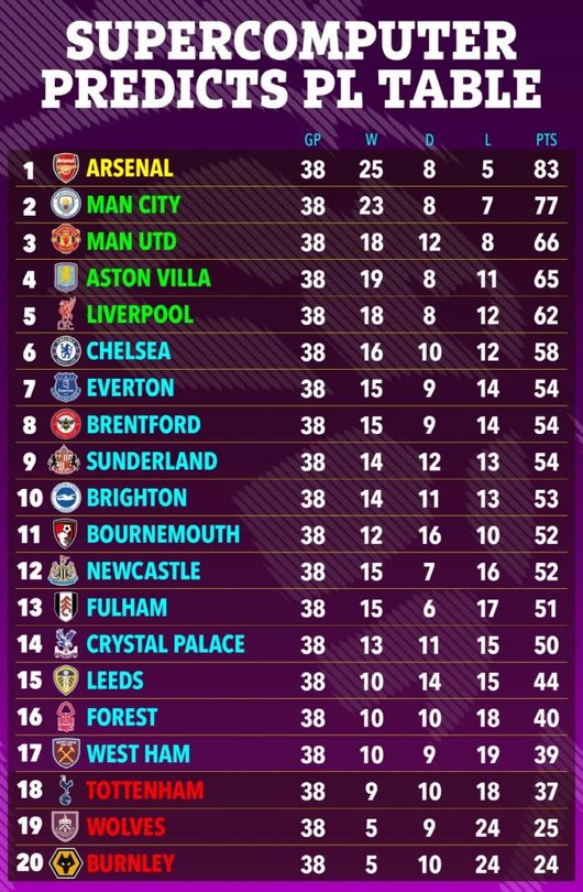 그럼에도 슈퍼컴퓨터는 아스날이 맨시티를 무난히 따돌릴 것으로 점쳤다. 아스날이 승점 83점을 기록하며 맨시티(77점)를 6점 차로 제칠 것이란 예측이다. 그리고 맨체스터 유나이티드, 아스톤 빌라, 리버풀이 그 뒤를 이으며 다음 시즌 챔피언스리그 진출권을 손에 넣고, 첼시가 6위로 시즌을 마칠 거라고 내다봤다.