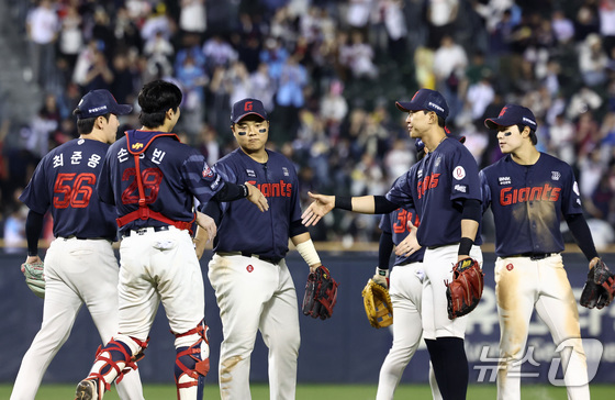 15일 서울 송파구 잠실야구장에서 열린 '2026 신한 SOL KBO리그' 열린 롯데자이언츠와 LG트윈스의 경기에서 2:0으로 승리한 롯데 선수들이 기쁨을 나누고 있다. 2026.4.15 © 뉴스1 최지환 기자