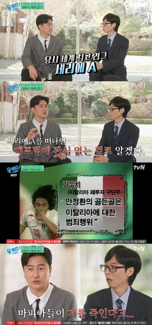 이어 안정환은 “잘못한 것도 없는데, 단지 이탈리아를 이겼다는 이유였다. 그 시절 한국 축구는 변방이라 더 받아들여지지 않았다. 마피아에게 살해위협까지 받았다”고 회상했다.