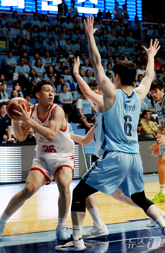 16일 경기 고양시 일산서구 고양소노아레나에서 열린 '2025~2026시즌 LG전자 프로농구 6강 플레이오프 3차전' 고양 소노 스카이거너스와 서울 SK 나이츠의 경기, 3쿼터 서울 SK 에디 다니엘이 고양 소노 이정현에게 마크 당하고 있다. 2026.4.16 © 뉴스1 이호윤 기자