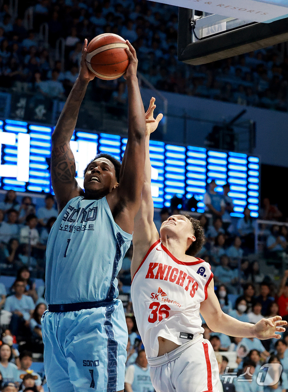 16일 경기 고양시 일산서구 고양소노아레나에서 열린 '2025~2026시즌 LG전자 프로농구 6강 플레이오프 3차전' 고양 소노 스카이거너스와 서울 SK 나이츠의 경기, 3쿼터 고양 소노 네이던 나이트가 서울 SK 에디 다니엘을 제치고 리바운드에 성공하고 있다. 2026.4.16 © 뉴스1 이호윤 기자