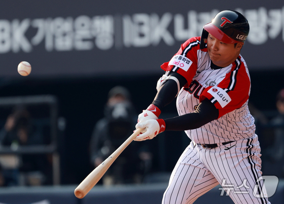 29일 서울 송파구 잠실야구장에서 열린 '2026 신한 SOL KBO리그' KT 위즈와 LG 트윈스의 경기, LG 문보경이 9회말 노아웃 주자 1루 상황에서 타격하고 있다. 2026.3.29 © 뉴스1 이호윤 기자