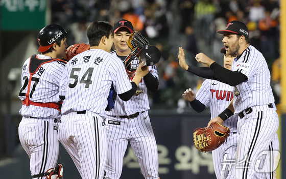 LG 선수들이 21일 서울 송파구 잠실야구장에서 열린 '2026 신한 SOL KBO리그' 한화 이글스와 LG 트윈스의 경기에서 6-5로 승리를 거둔 후 하이파이브를 하고 있다. 2026.4.21 © 뉴스1 김성진 기자