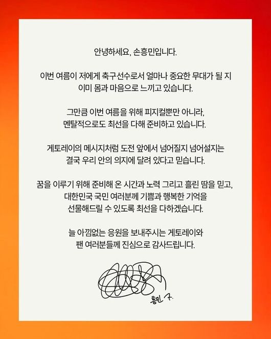 손흥민 역시 "이번 여름이 저에게, 축구선수로서 얼마나 중요한 무대가 될지 몸과 마음으로 느끼고 있다. 그만큼 이번 여름을 위해 피지컬을 포함해 멘탈적으로도 최선을 다해 준비하고 있다. 지금까지 준비해온 시간과 노력, 그리고 흘린 땀을 믿고 대한민국 국민 여러분께 기쁨과 행복한 기억을 선물해드릴 수 있도록 최선을 다하겠다"라며 각오를 다졌다.
