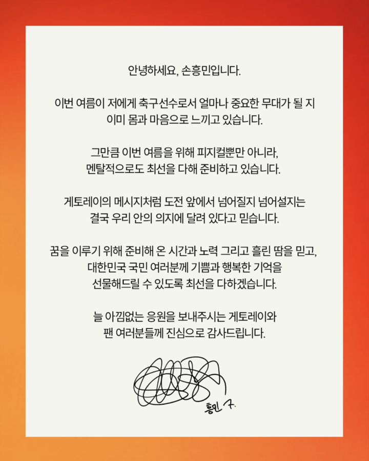 손흥민이 이번 북중미 월드컵을 어떻게 생각하고 있고, 어떤 자세로 임할 것인지 단번에 알 수 있는 메시지다.