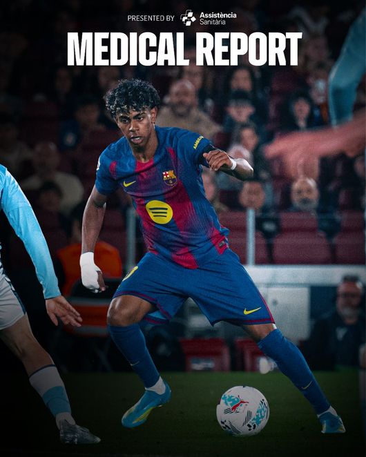 바르셀로나는 23일(한국시간) 구단 홈페이지를 통해 "검사를 실시한 결과 1군 선수 야말이 왼쪽 다리 햄스트링(대퇴이두근) 부상을 입은 것으로 확인됐다. 그는 보존적 치료를 받을 예정이다. 야말은 시즌 남은 기간 동안 결장하지만, 월드컵 출전 시점에는 복귀할 것으로 예상된다"라고 공식 발표했다.