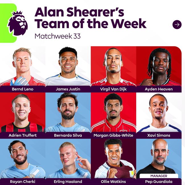 PL 사무국은 23일(이하 한국시간) 공식 채널을 통해 "앨런 시어러의 33라운드 이주의 팀이 여기에 있다!"라며 PL 역대 최다 득점자 시어러가 뽑은 베스트 11을 공개했다.