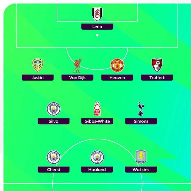 올리 왓킨스(아스톤 빌라)-엘링 홀란-라얀 셰르키(이상 맨체스터 시티), 시몬스-모건 깁스화이트(노팅엄)-베르나르두 실바(맨시티), 아드리앵 트뤼페르(본머스)-에이든 헤븐(맨체스터 유나이티드)-버질 반 다이크(리버풀)-제임스 저스틴(리즈), 베른트 레노(풀럼)가 이주의 팀을 꾸렸다. 이주의 감독은 팀을 8월 이후 처음으로 리그 선두로 이끈 펩 과르디올라 맨시티 감독이 차지했다.