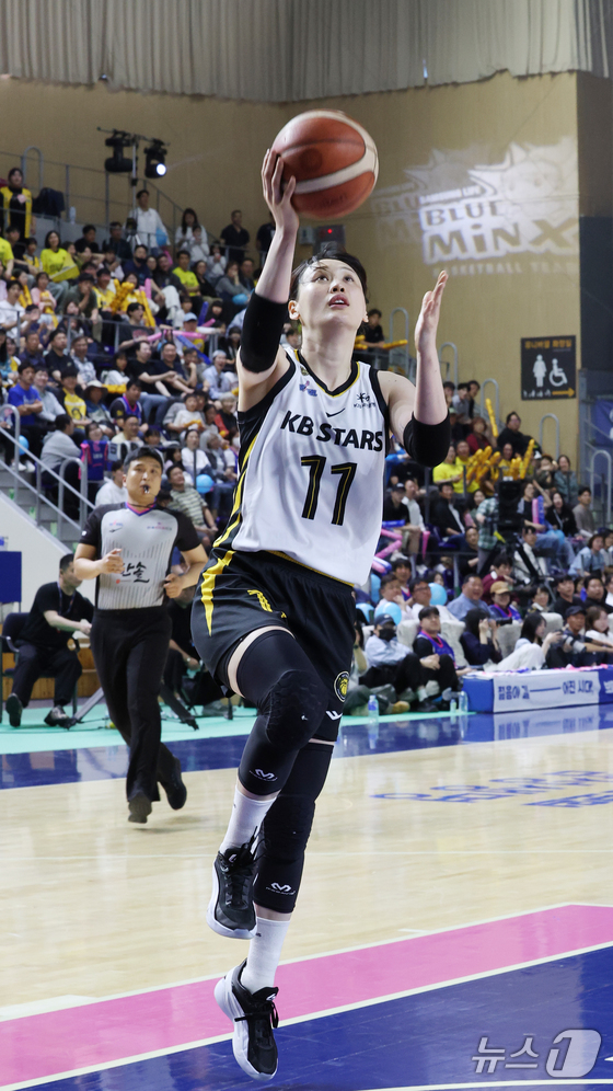 26일 경기 용인시 처인구 용인실내체육관에서 열린 'BNK 금융 2025-2026 여자프로농구 챔피언결정전 3차전' 용인 삼성생명 블루밍스와 청주 KB스타즈의 경기에서 KB스타즈 강이슬이 슛을 하고 있다. 2026.4.26 © 뉴스1 김영운 기자