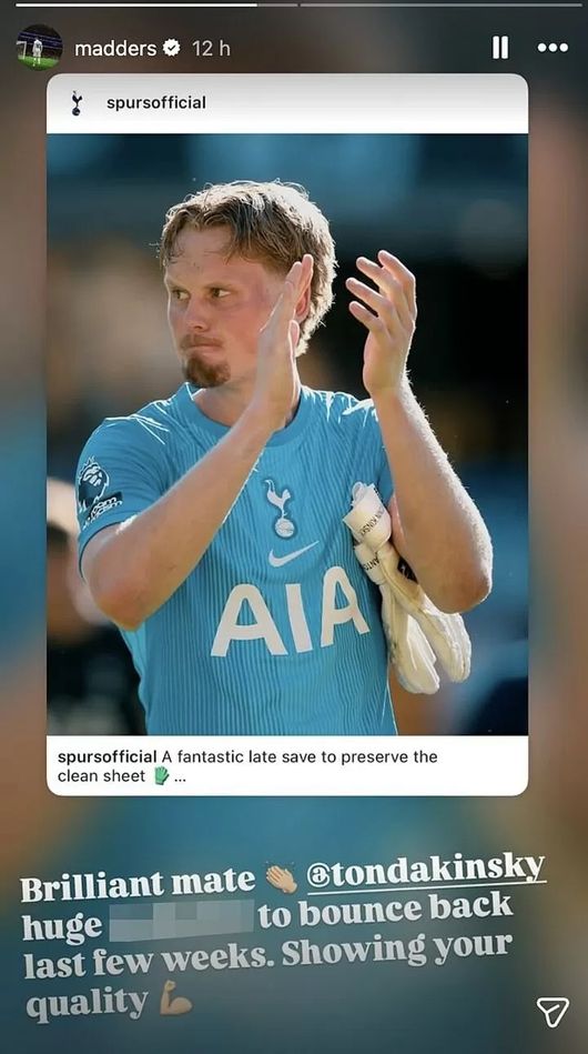 울버햄튼전 후에도 매디슨은 동료를 먼저 챙겼다. 그는 소셜미디어를 통해 골키퍼 안토닌 킨스키를 태그하며 “훌륭했다. 지난 몇 주 동안 엄청난 배짱으로 다시 돌아왔다. 네 실력을 제대로 보여줬다”고 격려했다.