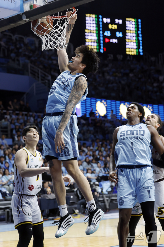 2쿼터 막판 46-39로 앞서던 소노는 이재도가 자유투 두 개를 모두 넣었고, 뒤이어 이정현이 3점 슛을 터뜨려 두 자릿수 점수 차를 만들었다.