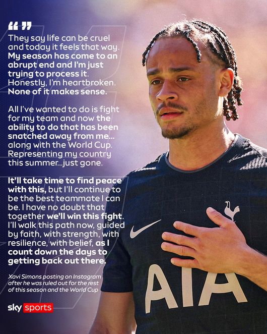 토트넘 팬들 사이에선 시몬스의 미래에 대한 우려도 나오고 있다. '투 더 레인 앤 백'은 "시몬스가 토트넘 관련 게시글을 모두 삭제한 건 충격을 안기고 그의 미래에 대한 심각한 의문을 불러일으키고 있다. 아직 시즌이 끝나지 않은 상황에서 나온 행동"이라며 "시몬스는 신체적으로도, 계약 측면에서도 불확실한 미래에 직면해 있다. 강등권 싸움 중인 팀이 핵심 선수를 잃고, 그 선수가 구단과 흔적까지 지우는 상황은 매우 심각하다"라고 짚었다.